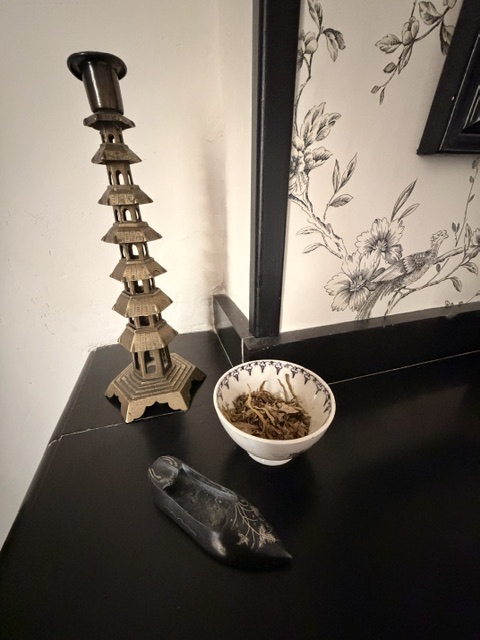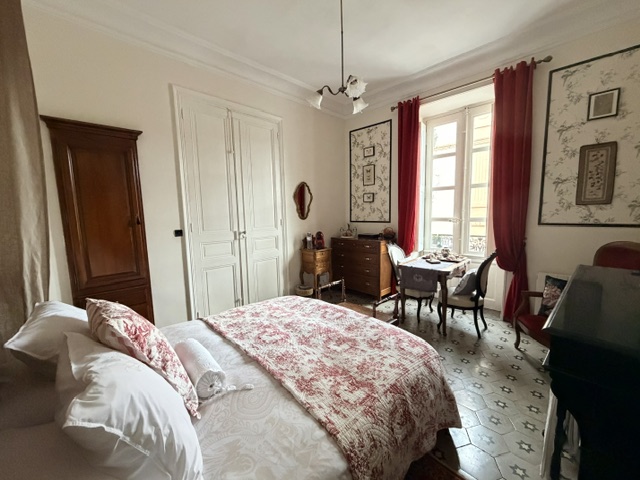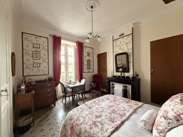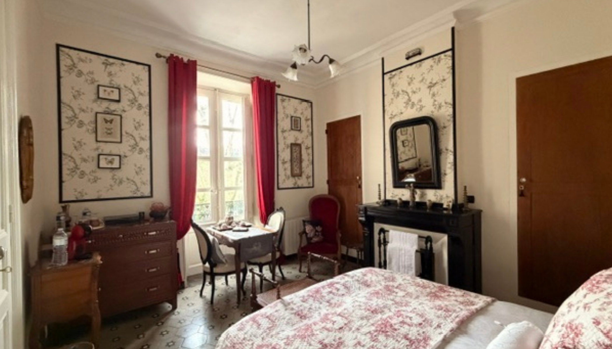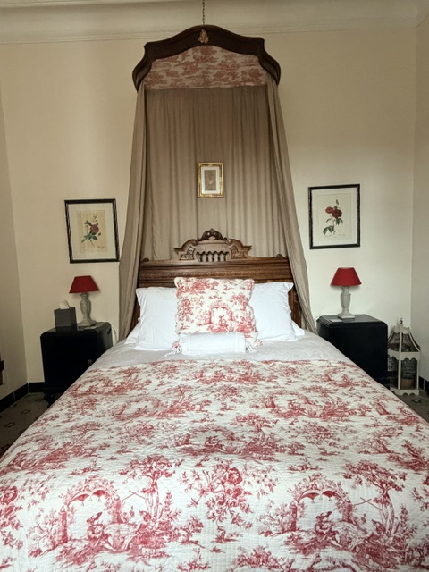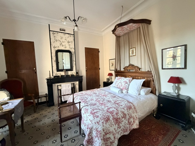 Chambre Alphonse de Lamartine (16m2) Très lumineuse avec vue sur le pont et les collines. Influence de l’Indochine dans sa décoration. La tête de lit est en bois sculpté et le ciel de lit est d’origine, grand lit de 160x200cm.