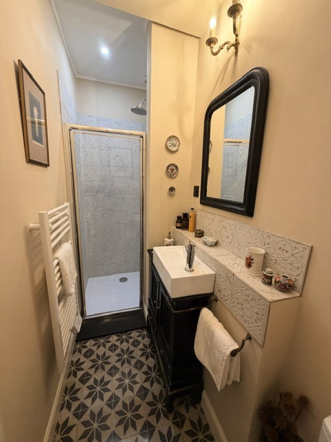 La salle d’eau est cachée derrière une troisième porte d’armoire. Plutôt cosy avec ses murs couleur miel, le bac de douche est de 90x90cm.