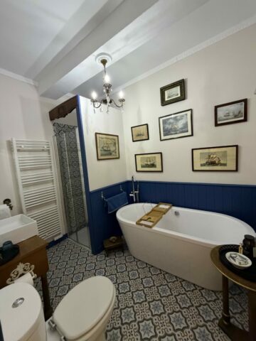 La salle de bain est au goût masculin avec ses boiseries dans un bleu soutenu et plusieurs tableaux marines. Elle est équipée d’une baignoire moderne en îlot et d’une cabine de douche à part.