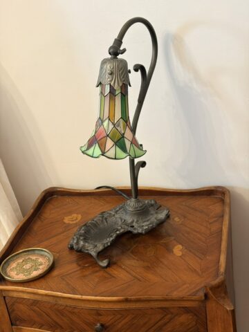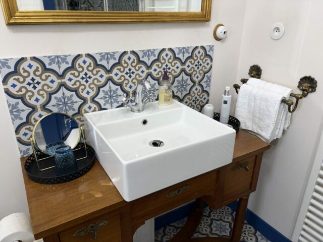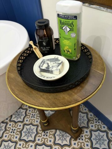 Les tables de chevet et travailleuse sont en marqueterie et deux jolies chaises chiavari Napoléon lll avec leur dorure d’origine complètent la pièce. Il y a un prie-Dieu en guise de porte-serviettes.