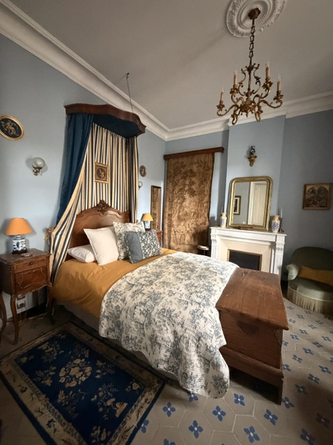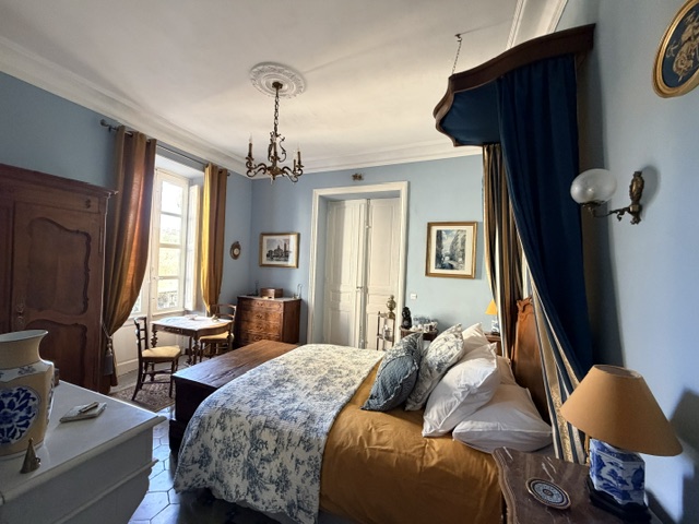 La tête de lit et les tables de chevet sont de style rococo. La grande armoire du 18ème siècle est en noyer. Le ciel de lit est d’origine et la cheminée en marbre blanc est de style Louis XV.